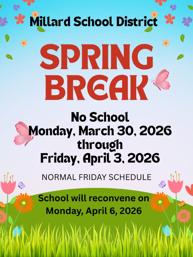 The next regular scheduled meeting of the Millard School District Board of Education will be held on Thursday, March 12, at 2:00 p.m. at the Millard School District Office, 285 East 450 North, Delta, Utah.